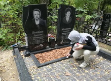 Так выглядит окончательный вариант места захоронения: памятники являются точной зеркальной копией друг друга, на землю уложена брусчатка, металлическое ограждение заменено на гранитный цоколь.
